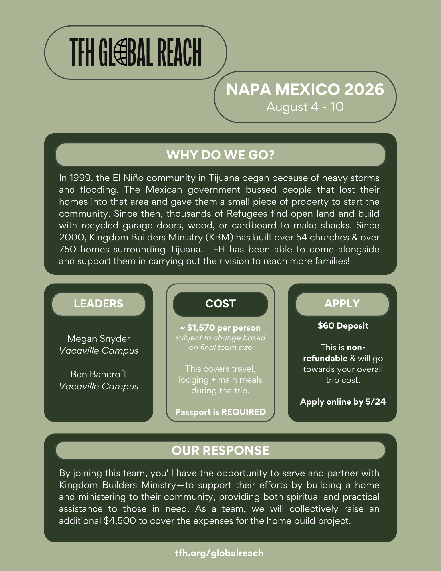 By joining this team, you’ll have the opportunity to serve and partner with Kingdom Builders Ministry—to support their efforts by building a home and ministering to their community, providing both spiritual and practical assistance to those in need. As a team, we will collectively raise an additional $4,500 to cover the expenses for the home build project.