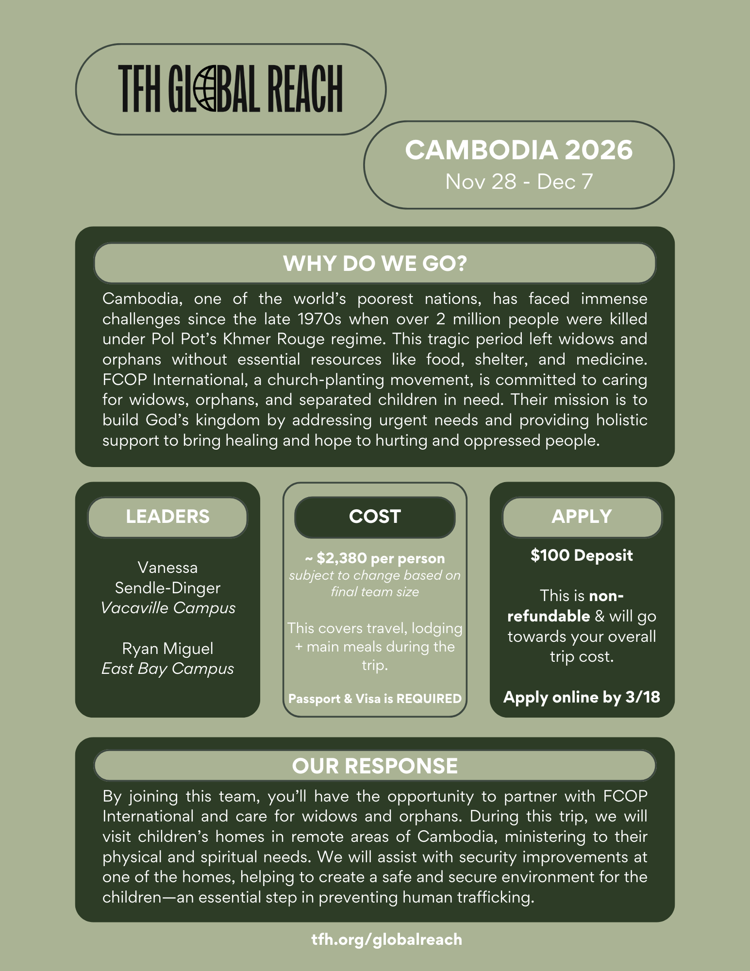 By joining this team, you’ll have the opportunity to partner with FCOP International and care for widows and orphans. During this trip, we will visit children’s homes in remote areas of Cambodia, ministering to their physical and spiritual needs. We will assist with security improvements at one of the homes, helping to create a safe and secure environment for the children—an essential step in preventing human trafficking.
