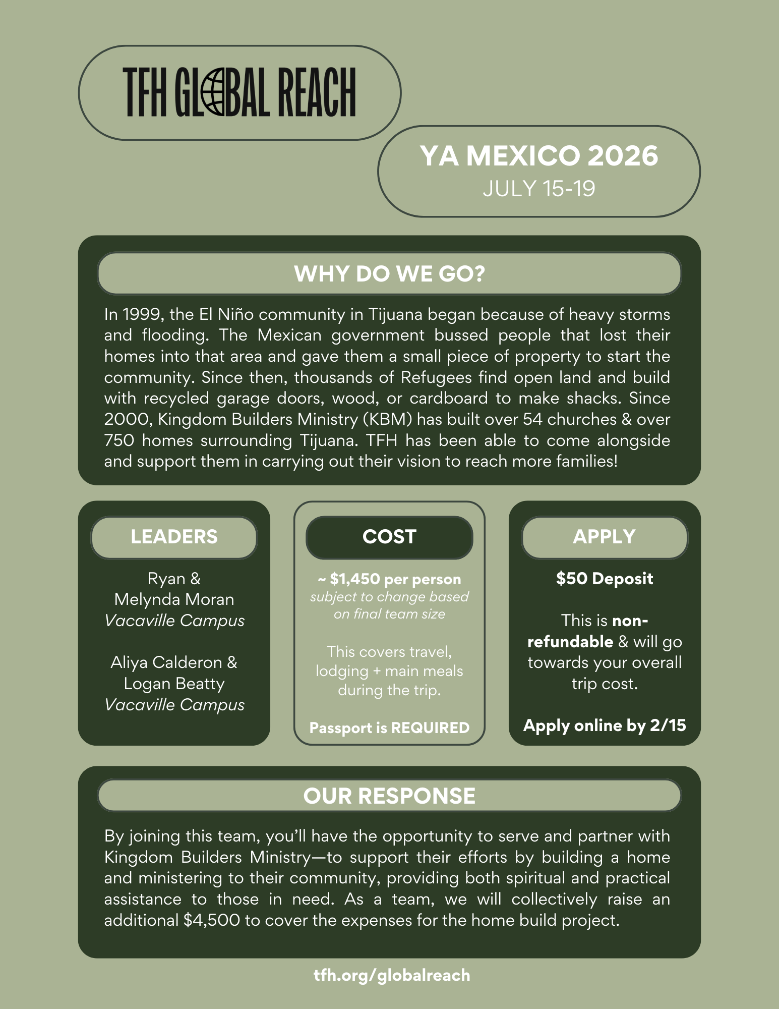 In 1999, the El Niño community in Tijuana began because of heavy storms and flooding. The Mexican government bussed people that lost their homes into that area and gave them a small piece of property to start the community. Since then, thousands of Refugees find open land and build with recycled garage doors, wood, or cardboard to make shacks. Since 2000, Kingdom Builders Ministry (KBM) has built over 54 churches & over 750 homes surrounding Tijuana. TFH has been able to come alongside and support them in carrying out their vision to reach more families!