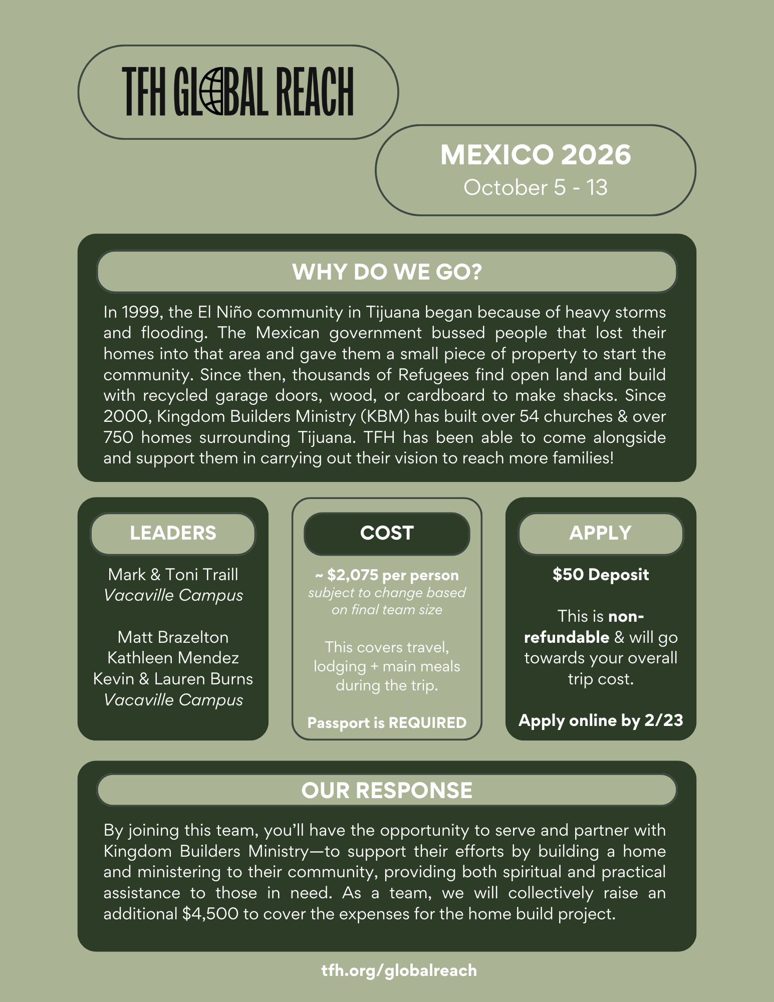 In 1999, the El Niño community in Tijuana began because of heavy storms and flooding. The Mexican government bussed people that lost their homes into that area and gave them a small piece of property to start the community. Since then, thousands of Refugees find open land and build with recycled garage doors, wood, or cardboard to make shacks. Since 2000, Kingdom Builders Ministry (KBM) has built over 54 churches & over 750 homes surrounding Tijuana. TFH has been able to come alongside and support them in carrying out their vision to reach more families!